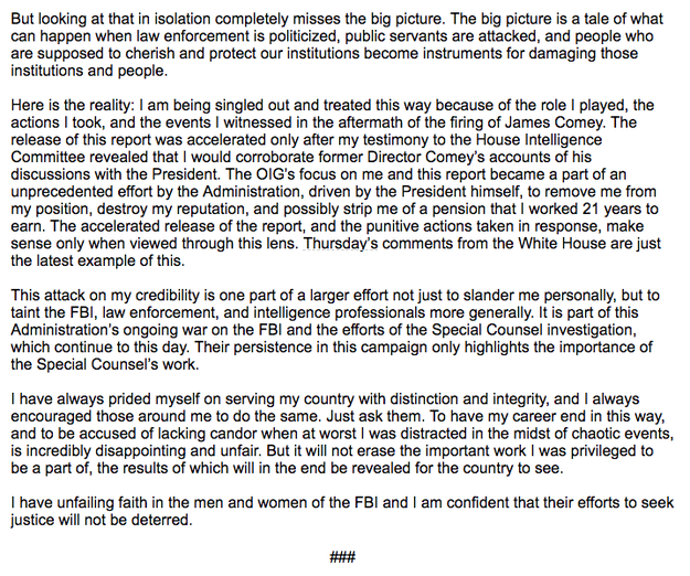 "I am being singled out and treated this way because of the role I played, the actions I took, and the events I witnessed in the aftermath of the firing of James Comey," McCabe said in a statement. "This attack on my credibility is one part of a larger effort not just to slander me personally, but to taint the FBI, law enforcement, and intelligence professionals more generally. It is part of this Administration’s ongoing war on the FBI and the efforts of the Special Counsel investigation, which continue to this day. Their persistence in this campaign only highlights the importance of the Special Counsel’s work."